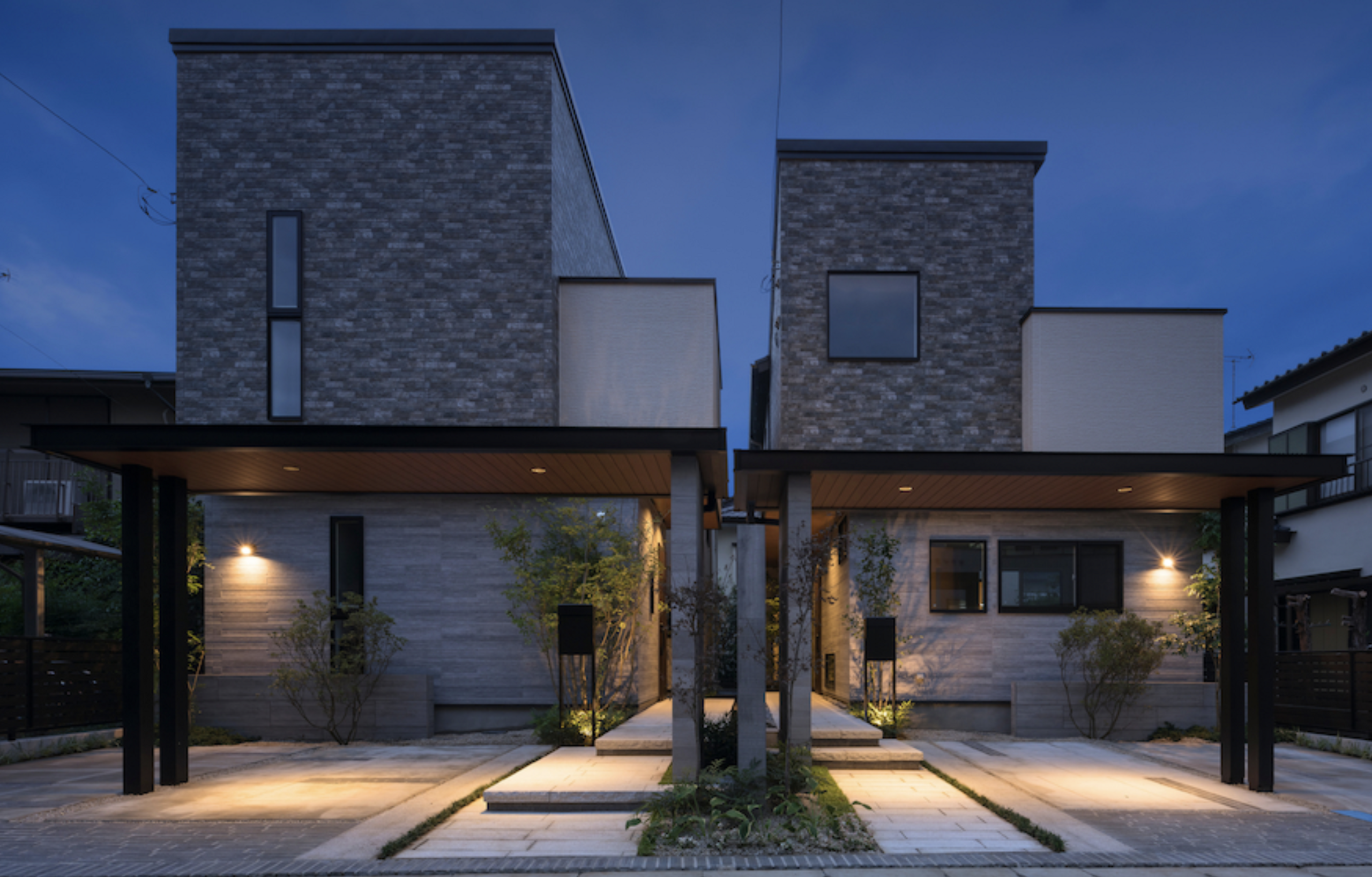 企業ブランディングに貢献すべく敷地購入から建築と販売を一手に引き受ける企業ならではの企画提案「グランデザイン」の実証案件である。敷地の区分けや建築規模や配置計画は先行することが多い分譲であるがこのケースは外部空間の利用価値を最大限に発揮すべく外から詰めながら全体を統一して計画するからこそ叶った事例。高低差を逆手に取り立体的造形を組み立て建物と外構の間に『庭間』を取ることで内外の繋がりが明確になったことに注目した。他にない分譲地として高評価を得た作品となった。