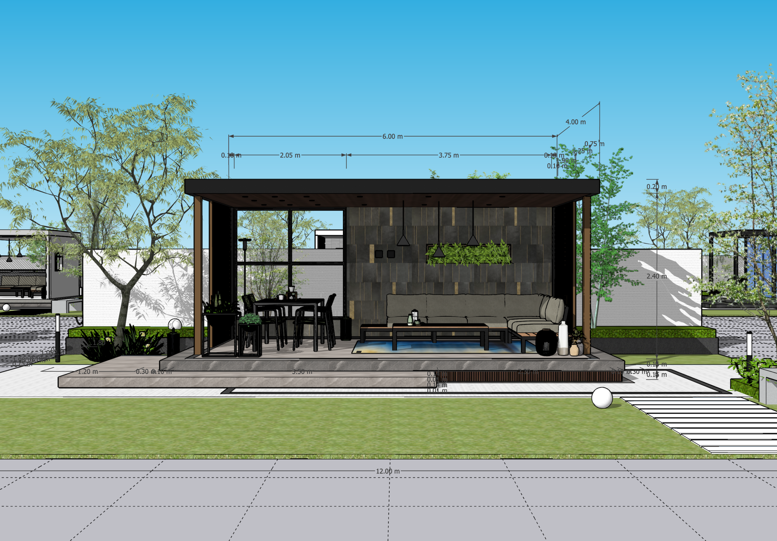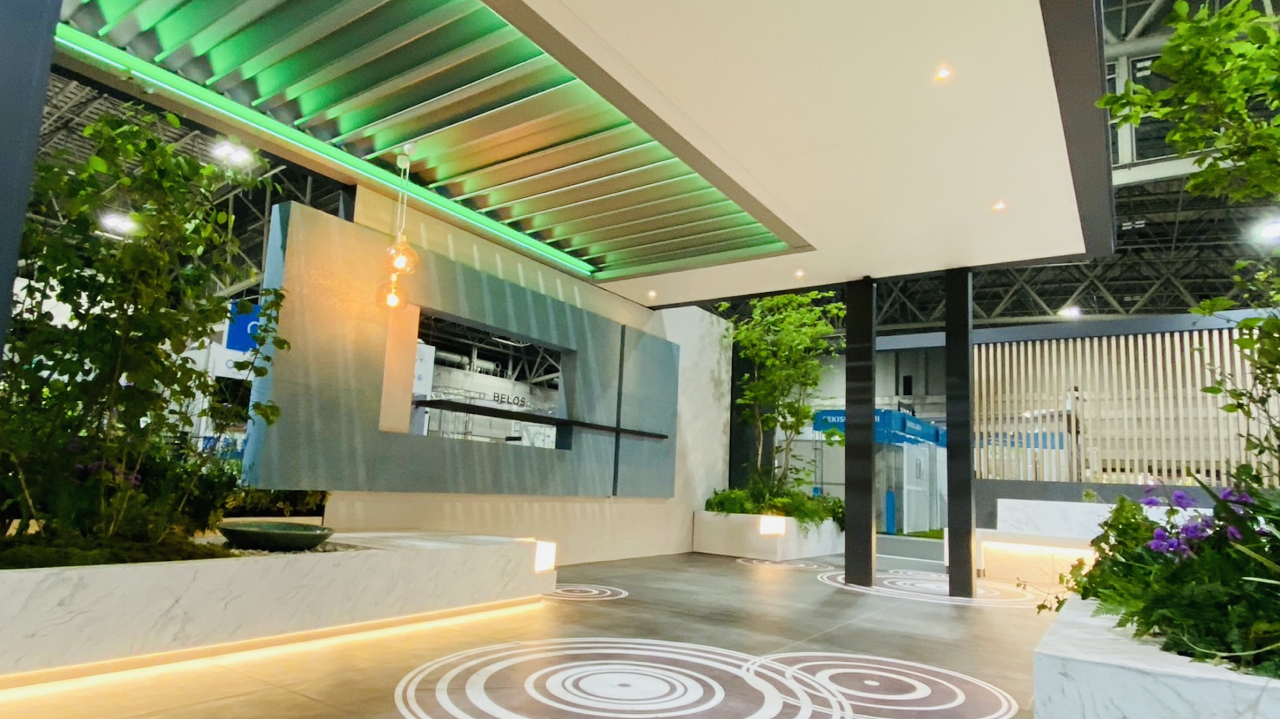 多くの装飾パーツを要するアルミメーカーの商品展開明確化は委ねられた業界とされるように計画提案する側の手腕によって採用商品と部材の空間構成が鍵を握っている。その具体例としてセカンドリビングをテーマにパッケージしたものがこの作品背景にある。屋根や壁面の構造は諸条件を把握し最大効果を発揮すべく造形にこだわり大面積の装飾性はコンセプトを明確に表すため素材チョイスが重要である。また、生活環境を外のに移すことが目的であるためファニチャーやスツールなど美観的設備類提案も必須でインテリア的発想を合わせ持つデザイナーが監修するからこそ実現出来た作品である。