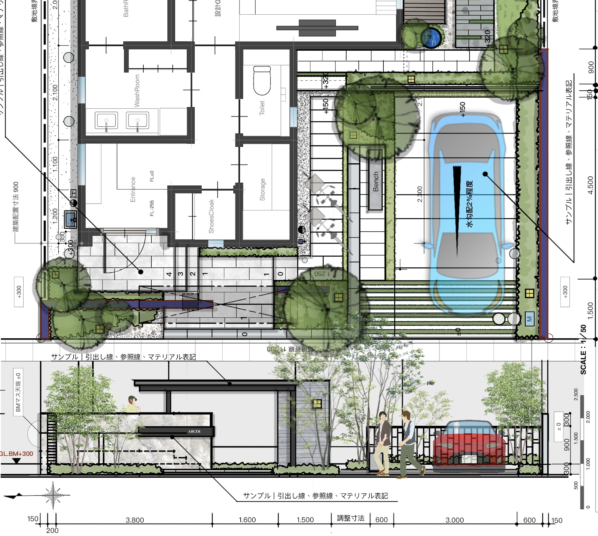 アルミメーカーが主導する先行型既成商品のセミフレキシブル化が進む中で新たな企画商品発売に伴い単に商品展示とならぬ空間演出を企画提案し実現した作品。商品の利用価値の明確化としてオープンスタイル計画を提案。大開口に対応するワイドスパンの梁を門まわり空間まで展開し一体感のあるファサードデザインを演出。車庫の舗装グラデーションや後方演出で立体感を向上させながら起伏ある大型花壇を要し上下左右の動きで楽しみのあるエントランス構成とし柔らかな装いの雑木を見えない結界として採用し迫力ある解放空地を具体化させたフラッグシップ的価値の実証例を実現した。