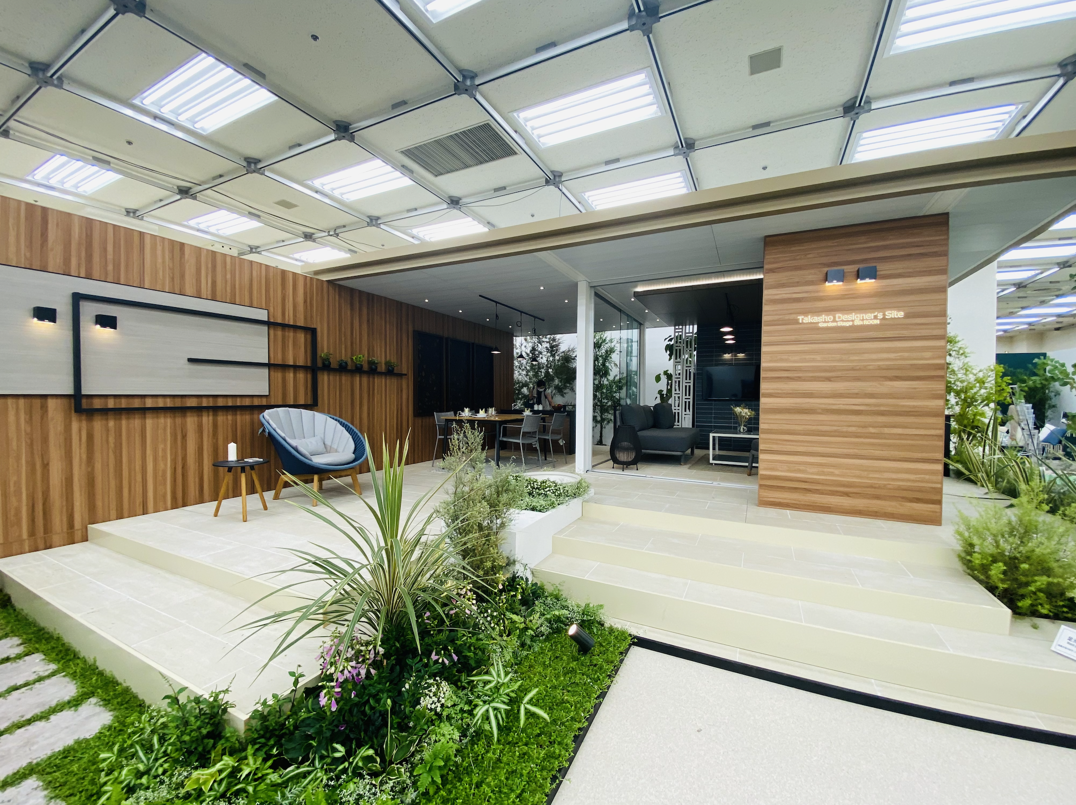 エクステリア業界に数あるアルミメーカーのひとつLIXIL内のハイブランド”NODEA”。ハイセンス商品ガーデンアネックスから新しい仕掛けとして開閉式の屋根が独立発売された。既存商品のプラスGに組み合わせて描くSOTOnoMAの世界を実証すべくインテリア的発想と連動したアウトドアリビング空間としてグランフェイスが意匠設計と施工監修を手掛けた作品である。庭の過ごし方は今もっとも注目されるもの。時代の変化やライフスタイルに合わせ植栽中心の提案から造作中心に変わりイニシャルコストをかけローメンテナンスを選択すればやはり素敵な屋外空間は求められるでしょう。業界には本物思考のアウトドアテラス実例が少ないこともあり多くの目に触れる業界随一の一大イベントに展示し世に発信することが出来たことに大変嬉しく記憶に残る素晴らしい作品となった。