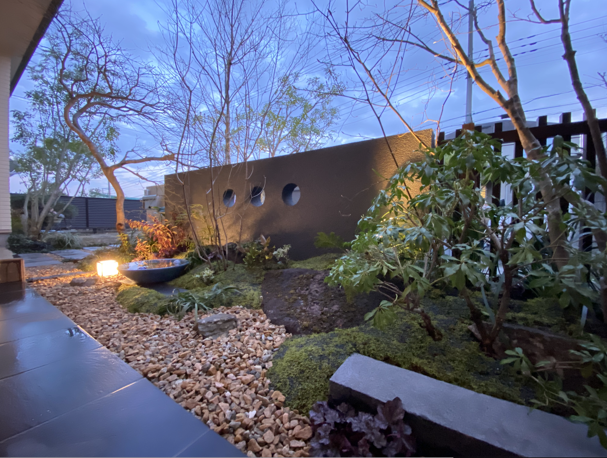 十数年前に前身事業時に携わったクライアント様からガーデンエリアのリノベーションを要望され実現した作品。当時から坪庭計画を前提とした和室前から眺め見る空間確保を要望され、このタイミングで実現することになり改めてご依頼を承った嬉しい案件である。既に造形や手掛けていたので造園的手法を用いて今のライフスタイルに合わせたモダン和風庭園を提案し創造したイメージを現場で組み立てる。苔の土台をベースに山野草を散りばめつつく柔らかな装いの落葉樹で上空面を覆うと同時に眺めと景観を向上させた。限られた数量の照明も最大効果を発揮する機材と位置に気を配り時間の経過変化も演出として取り込み常に眺めみる心地良さを表現した事例である。