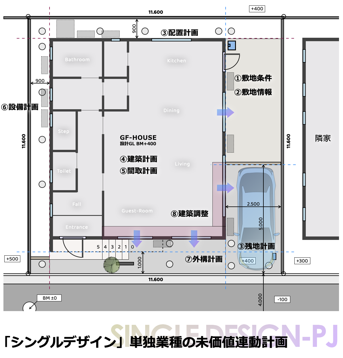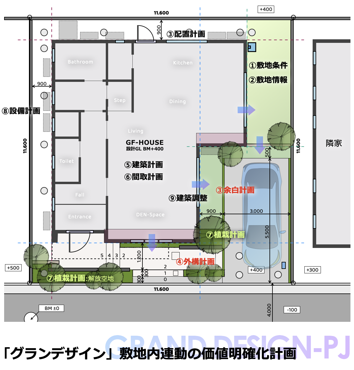 住まい提案として今求められる最適な平面計画「敷地内連動型プラン」です。資産となる敷地に備わる主要業種”建築・内装・外構・主庭”が内外として隔てることなく生活環境を有効活用すべく設計レギュレーションで描くことで建築計画における外部計画の課題を把握し事前に防げるメリットがあるため最適な計画が欠かせないのです。特に着目点は『余白空間』を区分間に振り分け設けていることです。ゆとりを持たせた提案には住まい価値を高め魅せる効果があります。こういった計画を当然のように計画出来る企業や設計者との出会いが欠かせなくなるのです。