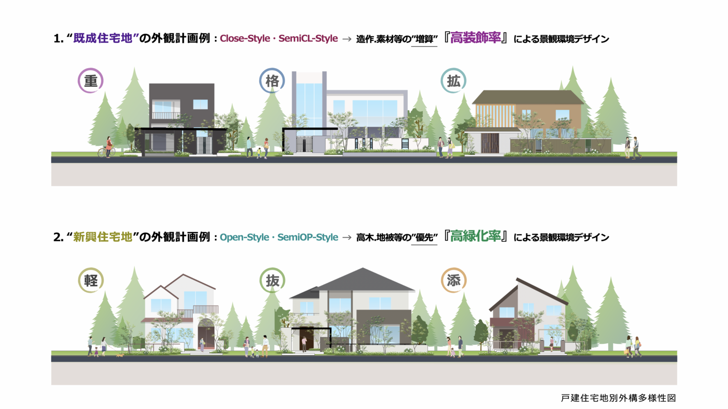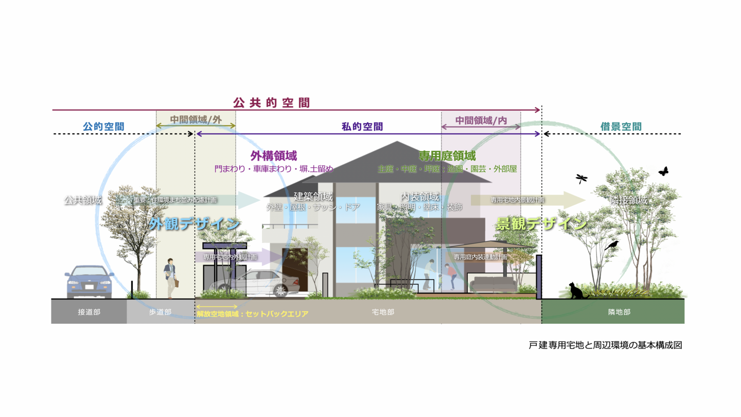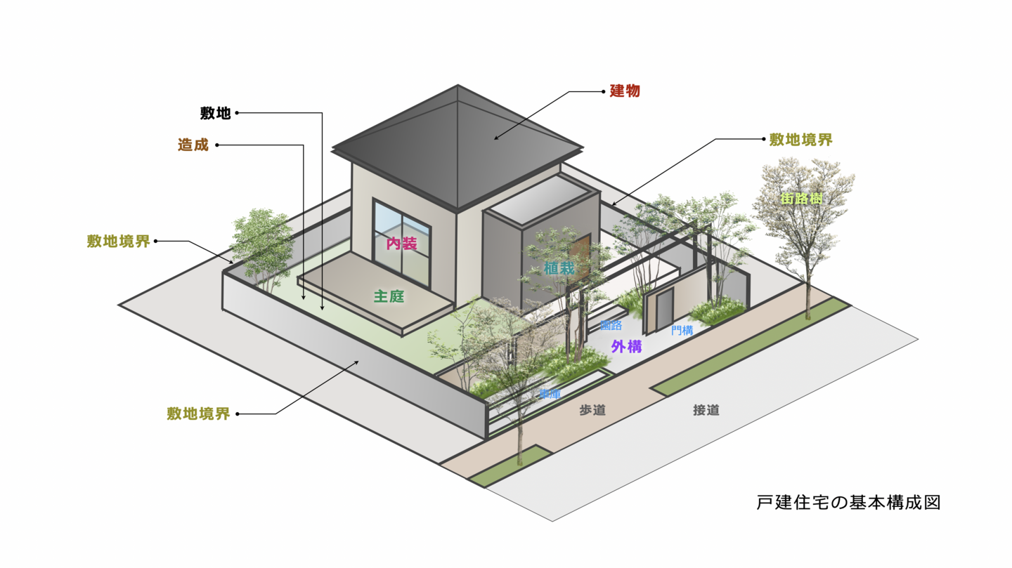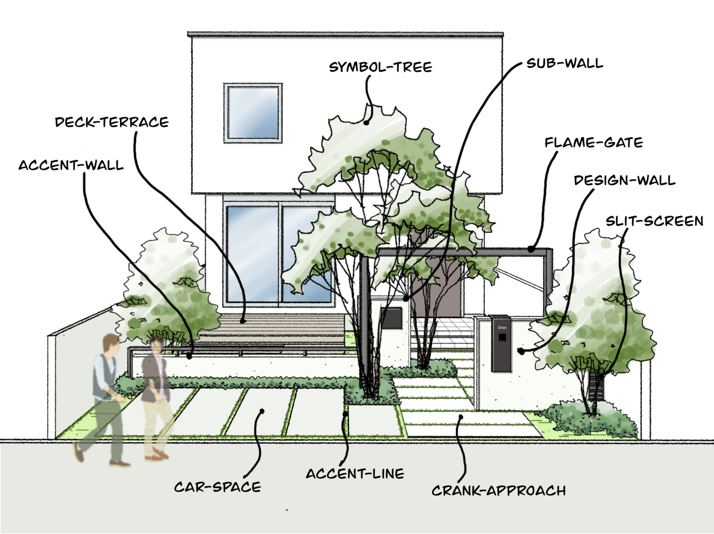 敷地面積から建築物を差し引いた残りの敷地を外部空間と言い建物を主体にまち並みやライフスタイルを総合的に演出するのが外構計画「エクステリア&ガーデン」です。外構とは車庫や門構や塀土留めなどの機能的要素というイメージがありますが道路と接する敷地形態のなかで最前列に位置し建物前に備わる最初に目に触れる用途であることから住まいの立地環境やまち並み景観に配慮しつつ敷地の外から眺め見て意匠性を連動させ住まいの価値を付加し高める演出要素として外観デザインを操作する重要な役割を担っているものです。そのため機能性に合わせコンセプトやテイストや趣味趣向を表す装飾性や意匠性、素材感や色彩、環境配慮緑化など様々な連動が欠かせないため背景となる建築物と同時進行で計画する方が良いとされています。屋外では天候や環境に影響されやすいことから専用の設計手法や素材選択が求められる特殊な業種でもあります。