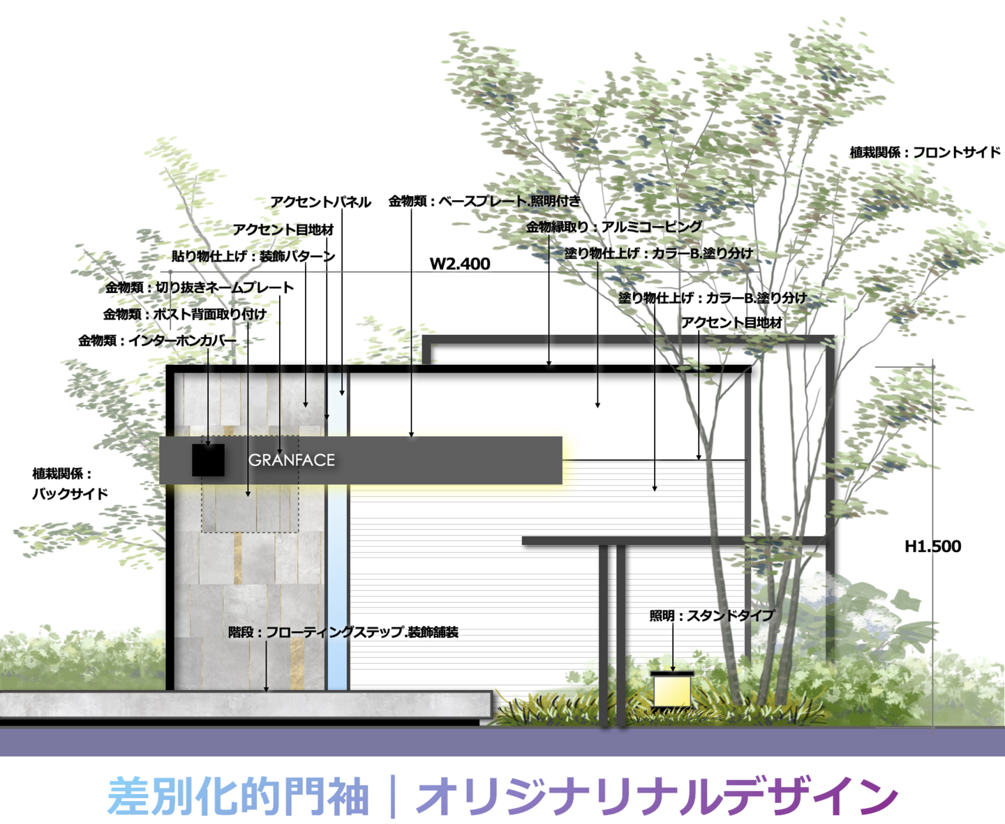 こちらのプランは「専用意匠型門袖」のパーツデザイン事例です。建築デザインからコンセプトやテイスト設定に合わせ様々なモチーフや採用された素材や色などを抽出して演出した特別に設えたデザイン案です。これは設計者がコンセプト設定に合わせたパフォーマンス&スキル構成によって組み上げる特別なデザインになります。特に外部空間設計の醍醐味であり差別化要素としてオリジナル門袖のこだわりは住まいの顔といわれるようにとても重要な部位となるのでコストやデザインを最大に活かして計画する方が望ましいことからしっか提案してくれる設計者を選ぶことも大切でしょう。