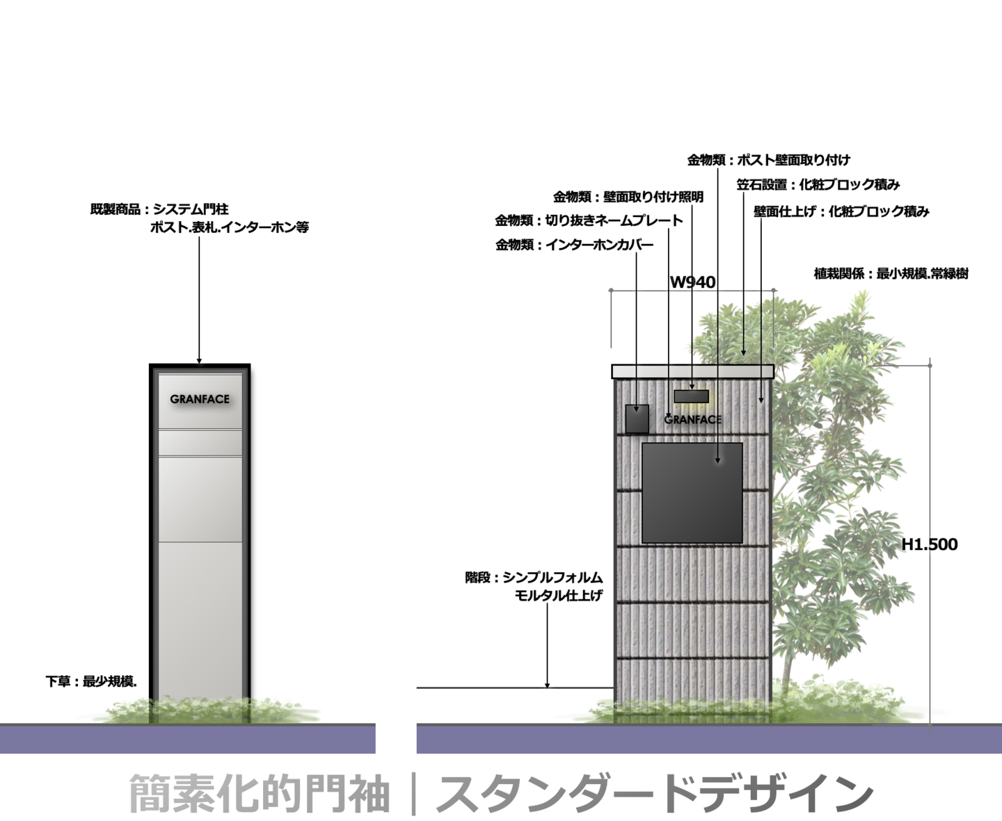 こちらのプランは「既製選択型門袖」のパーツデザイン事例です。建築優先で外構計画を後回しにした結果、検討時間削除や外構予算削減や設計者ロースキルなど様々な影響で安易な提案でありもっとも避けたい計画でしょう。既製商品は意匠や高機能や高品質や短工期などから選択メリットがありますが発売元に左右されやすい傾向があります。また単純にブロック2列+必要小物のパッケージは古風なものがになりがちでありどちらも差別化に欠ける要因が高いです。毎日見る場所にあるパーツに夢や喜びを感じるためにも安易計画で他に存在する提案とならぬよう注意が必要でしょう。