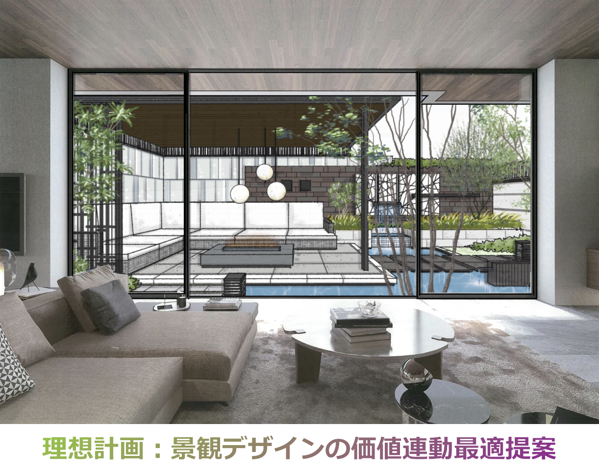 こちらのプランは「内外連動型提案」の理想を具体化した庭の新しい利用価値を表した計画です。ハイブランドの家具や装飾でコーディネートされたこだわりのインテリアに合わせ眺め見る窓先の景色を切り取り見せる”ピクチャーウィンドウ”を演出し価値連動とテーマ性のバランスと広がりを具体化した屋外空間演出『アウトドアリビングスタイル提案』の最適形となっています。庭の形は造園や園芸などの伝統ある植栽中心の提案からライフスタイルの変化によってメンテナンスの削減や利用価値向上を目的とした結果表されたプライベートガーデンのニュースタイルとして注目され高いデザイナースキルが要求されるものです。