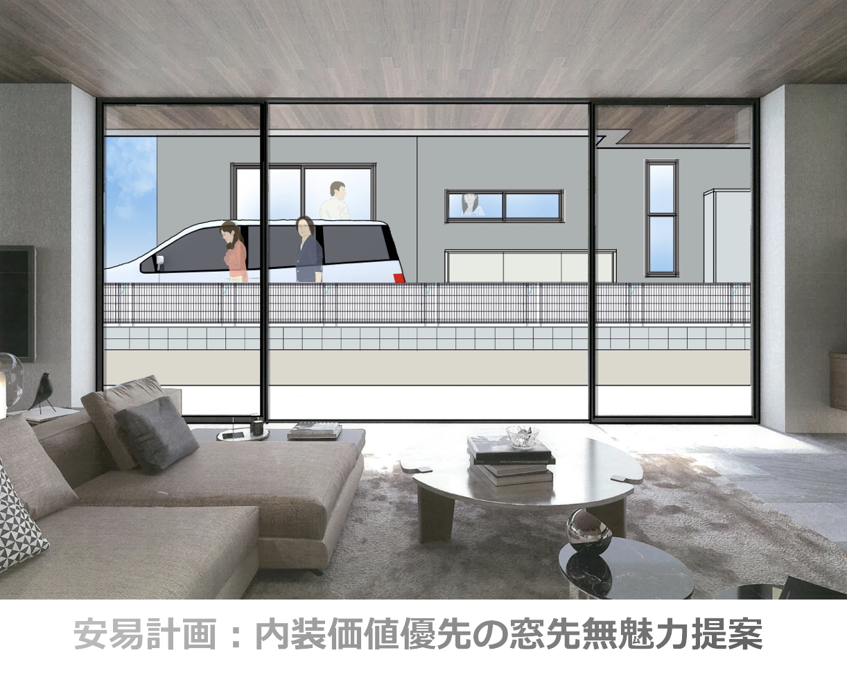 こちらのプランは「内装先行型提案」でよく見られるデメリット的主庭計画事例です。建築と内装は生活に密接したエレメントであるためこだわりある装飾演出を最優先したことにより庭への意識が低く窓先の景色にまで提案が行われず隣家から覗かれるような無演出で無魅力な外部空間には興味も湧かないためウィンドウトリートメントのカーテンやブラインドで覆い隠して終わりとなるケースがよく見受けられます。また予算が回らないとして別途工事や未提案といったものが多く結果として敷地外周部のブロックフェンスや窓と繋ぐテラスや庭は芝生程度といった簡易要素で完結するといった寂しいものに価値は見出せないでしょう。