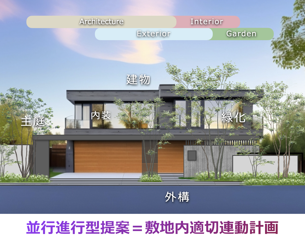 「生活するには建物と内装があれば済む!」という考えで始める計画には住まいが醸し出す佇まいや価値は不明確なものとなり本来期待していた住まいの形とは程遠いものとなってしまうでしょう。建築計画が先行するのが一般的に思われがちですがここに落とし穴がありデメリットでしかありません。何故なら敷地に対して先行した建築が単に箱は大きい方が良いという安易な思考で肥大化し外部空間の理想を置き去りにしたことでスペースとコストが及ばなくなるとおうマイナス要因が嵩んでしまいます。注目すべきは建築先行型の提案ではありがちのパターンでエクステリア計画を思案するタイミングは建築と内装が決まった後に外構を計画するとなれば結果として『余った敷地と予算』となり提案も出来ないほど手の施しようがなくなってからでは既に遅いのです。