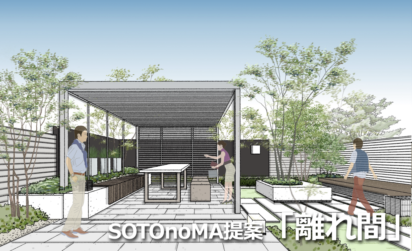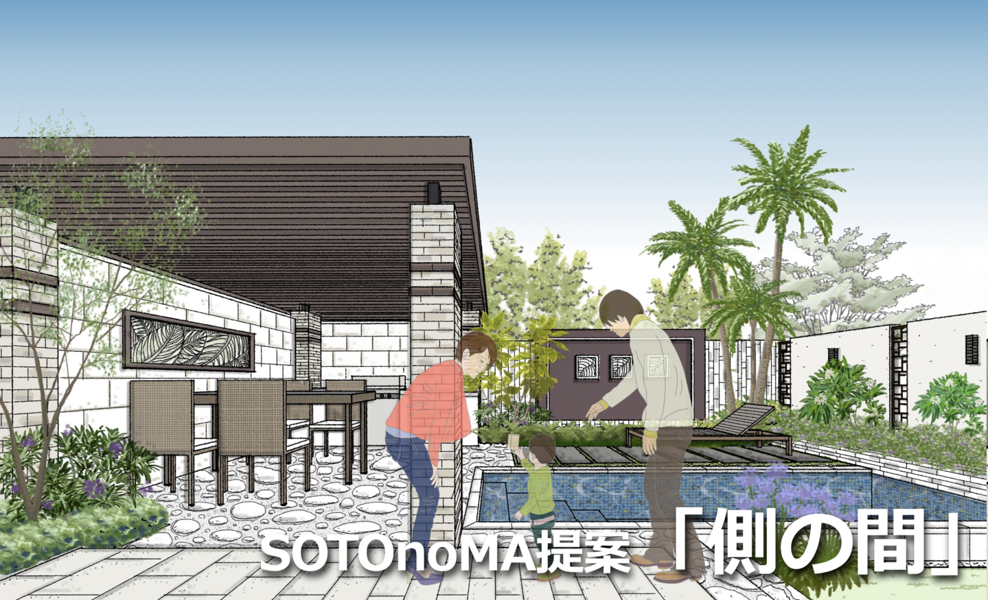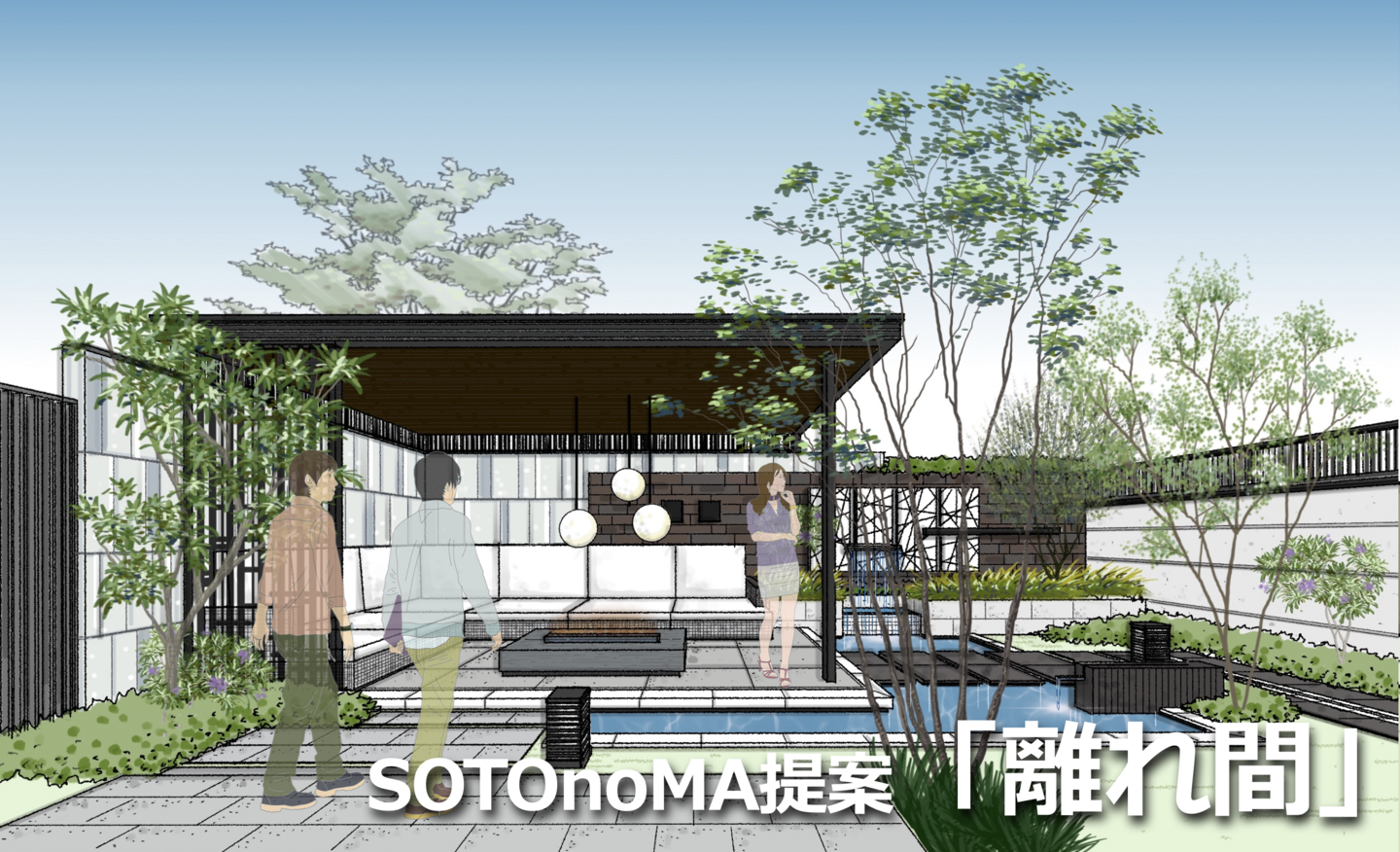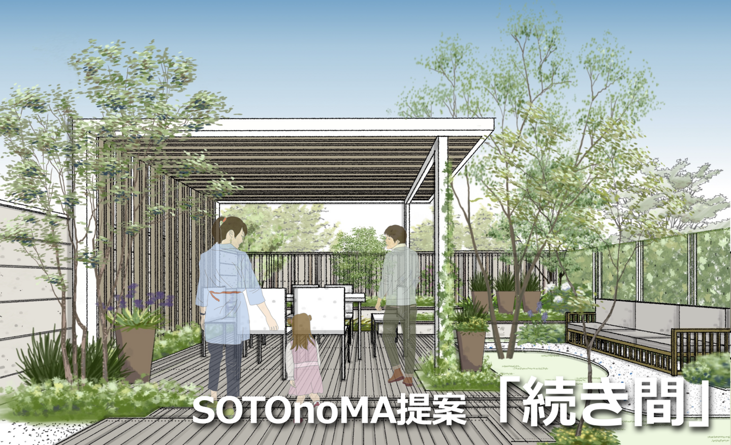 自邸の余白に居室以外の生活環境を探求し庭の価値を眺め見るものから滞在し楽しむ特別な空間として追求した結果「アウトサイドルーム=SOTOnoMA」として表現される。植栽が中心の業界は今アウトドアリビングと称した造景にバランスを変えながら自然環境と共存しもたらす特別な力を体感し継承する意味と役割を明らかにし造形と植生を操作し企画提案するのが私たちの使命である。