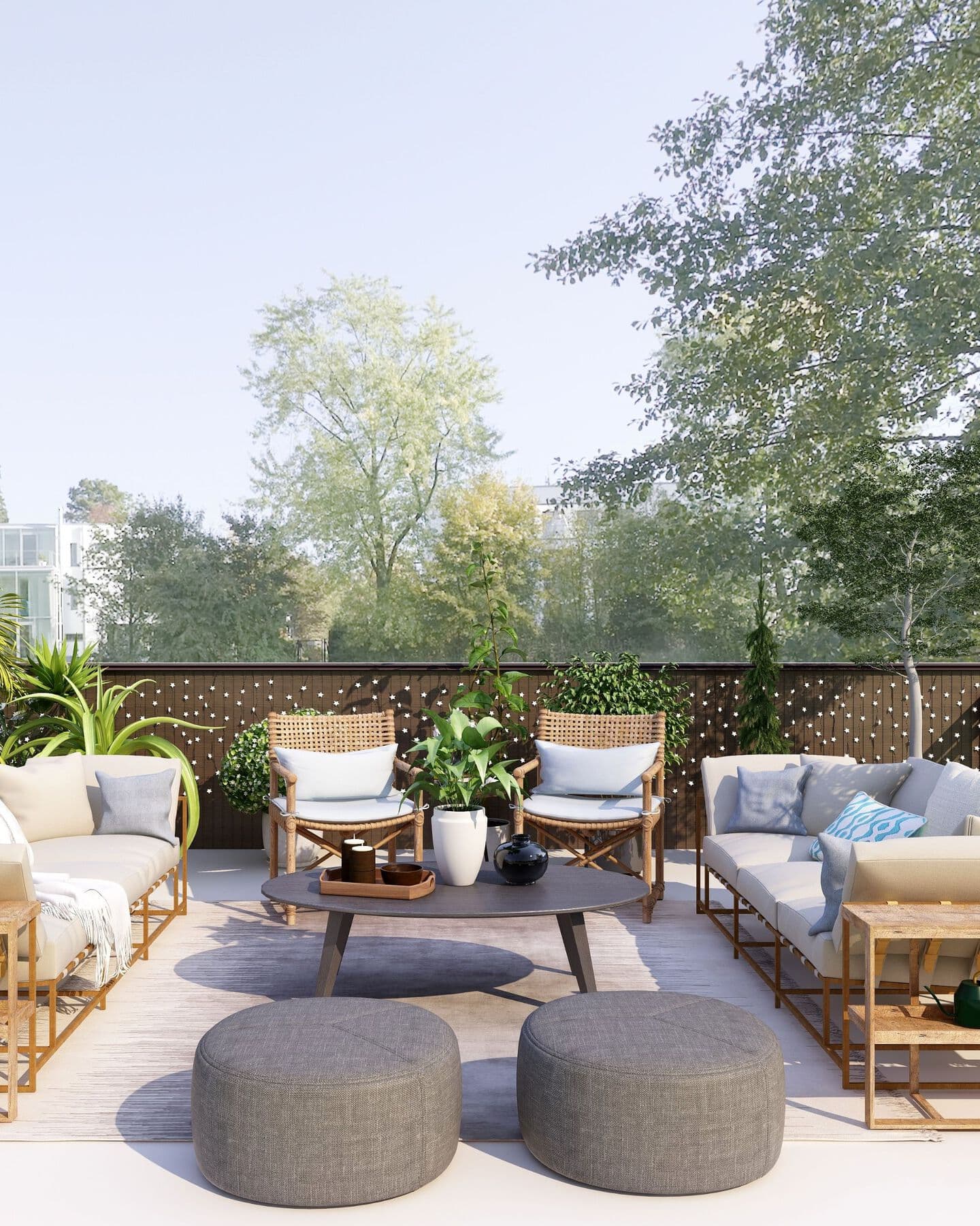ナチュラルスタイルとは主に植栽や天然素材を中心に設定し柔らかな線形やエッジのほぐれた形状で構成し自然環境に溶け込むように描く提案としています。特に植栽を優先し造作は抑えめにまとめることがポイントになるでしょう。基本色はライトカラーにアクセントにホワイト色を用いた。ステージはウッドデッキとし天然木材を使用し暖色系のパーゴラで光を取り入れ温かみある印象にする。境界部の背景の壁も同様に木材を活用しつつデザイン性を高めるため色合いの濃淡や線形の太さや厚みに変化をつけオリジナリティーを用いたフェンスを造る。床面は地被を優先に採用し必要以上の舗装は避ける。家具も設定に準じたデザインを採用し全体に散りばめる。以上のような設計ポイントを予め設定しスタイルを明確に表した提案例である。