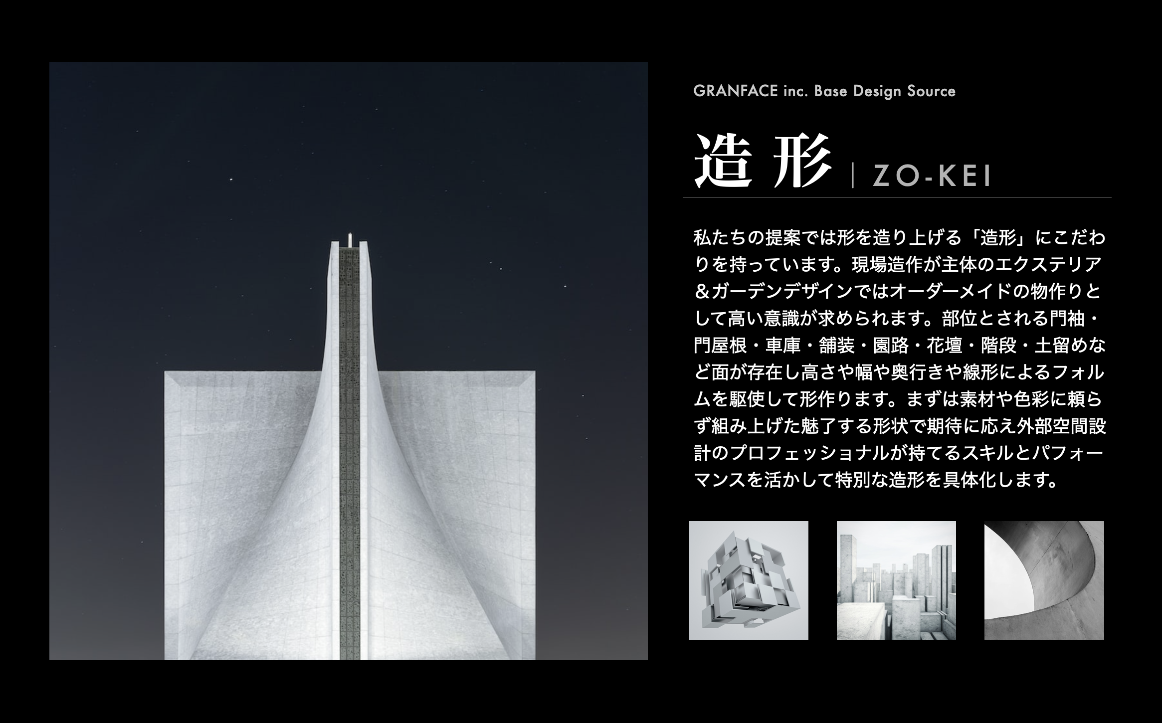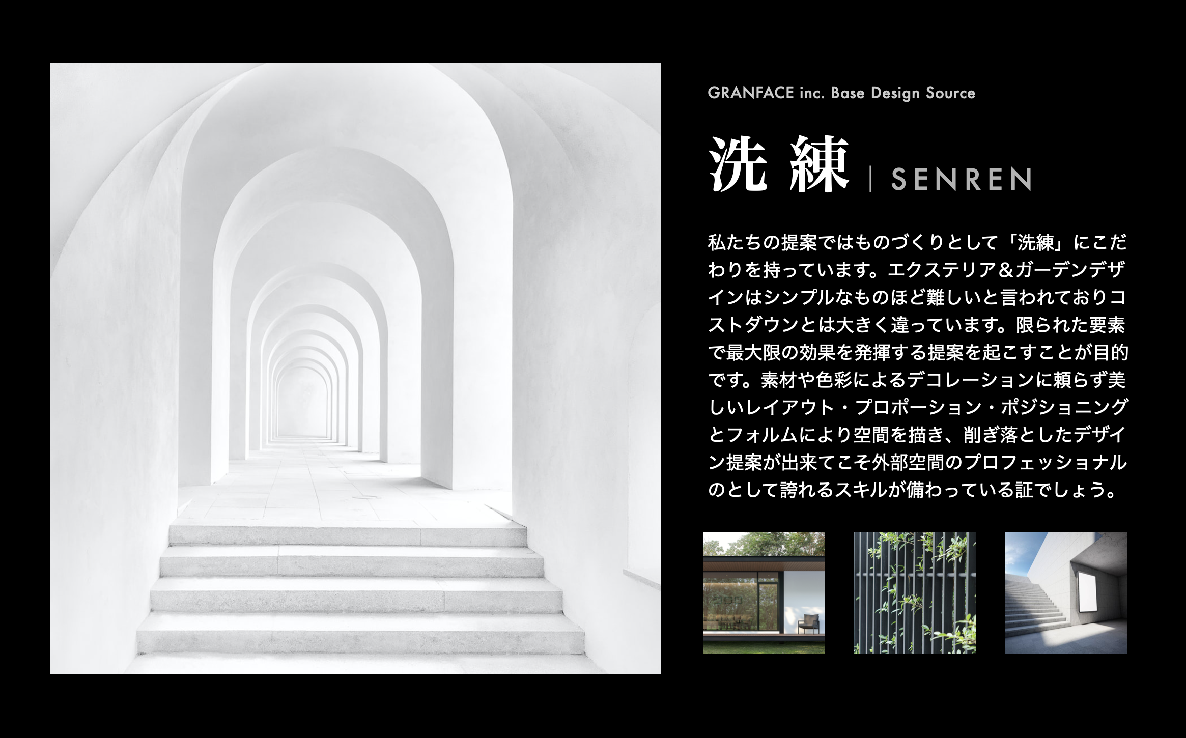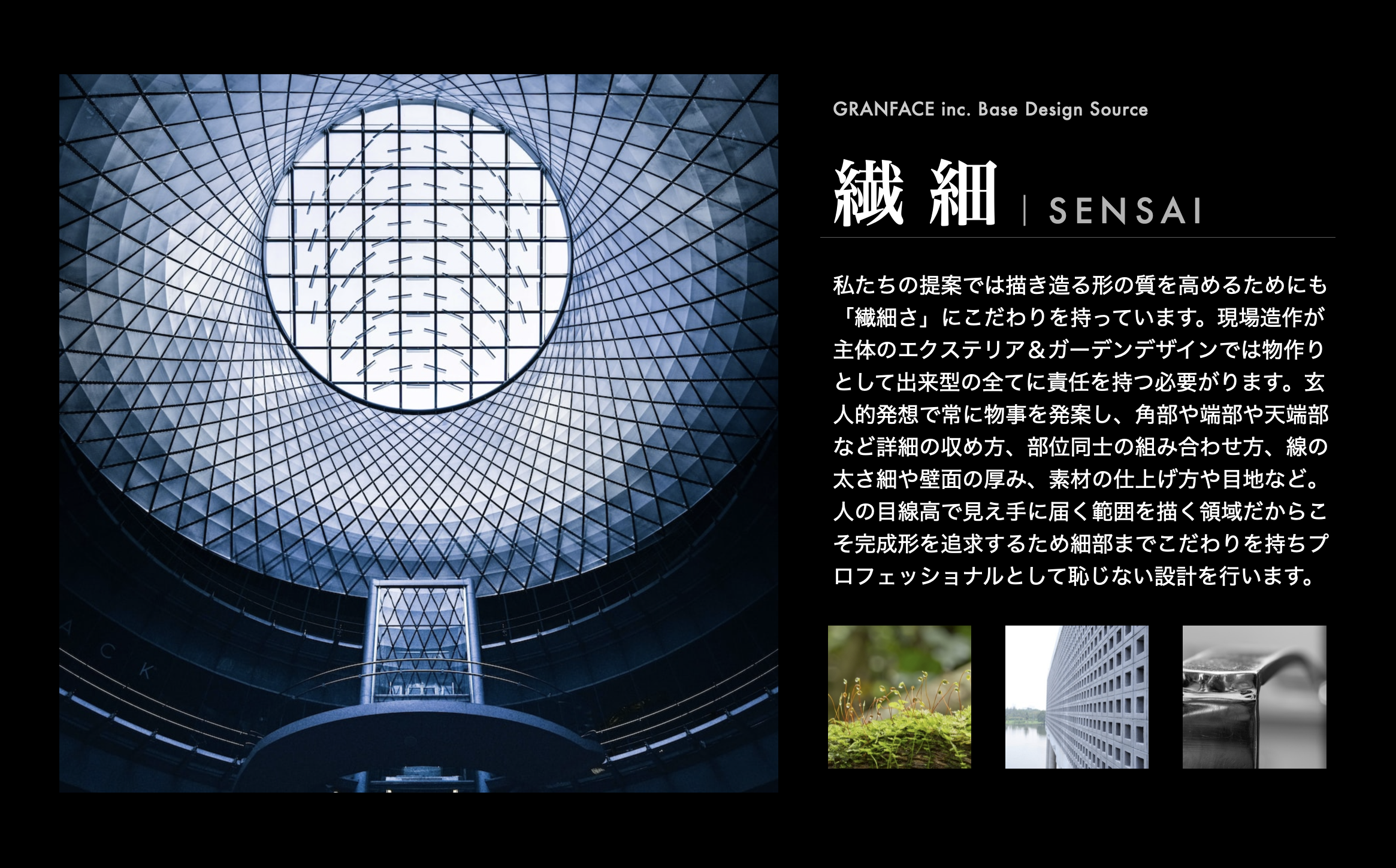 GRANFACEの拘り|様々なテーマやコンセプトやスタイルなどニーズに応じらる企画提案を目指し「外部空間デザインのオールラウンダー」として真剣に取り組んでいます。建築や内装との意匠性や機能性を併せ持る連動を行うために関わり合う多くのスキルストックが重要であるとし削ぎ落としたシンプルデザインから重厚感漂う装飾演出を持つハイエンドデザインまで幅広く本物の価値を追求しバリエーションに対応出来るプロデュース業のコンダクターとして役割を担います。